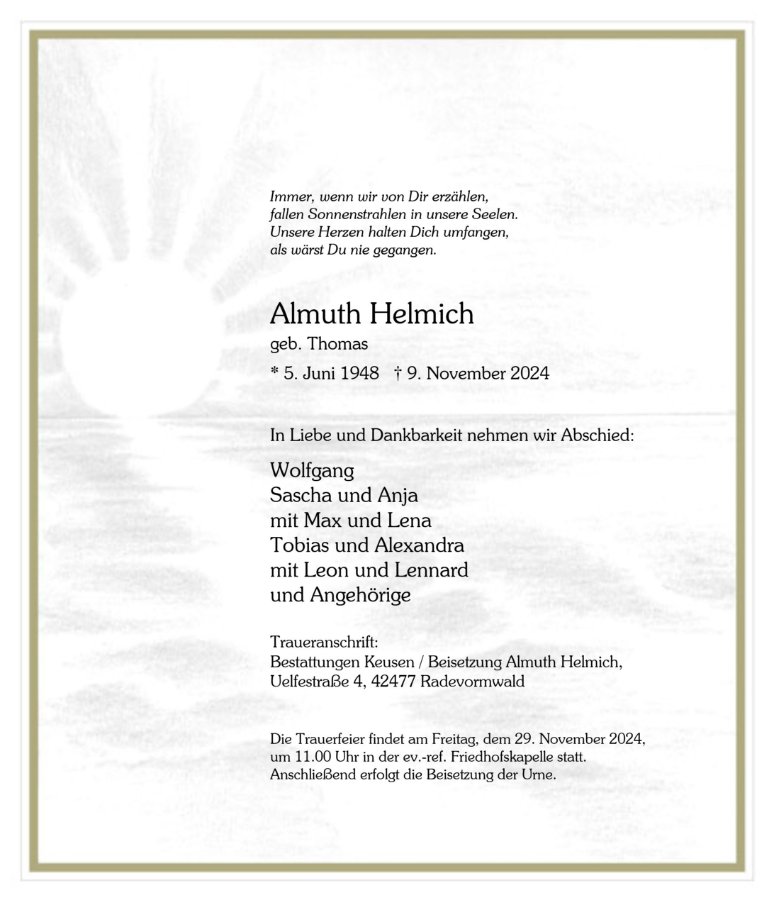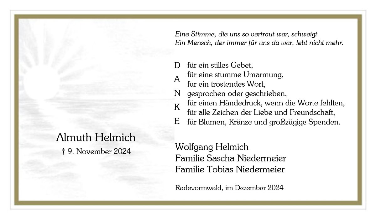 in diesen Tagen fühlen wir mit Ihnen und wünschen Ihnen von Herzen, dass Sie aus den glücklichen Erinnerungen Kraft schöpfen, um positiv in die Zukunft zu gehen. Diese Gedenkseite möge Ihnen dabei helfen, Ihre Trauer zu teilen und das Andenken gemeinsam wachzuhalten.