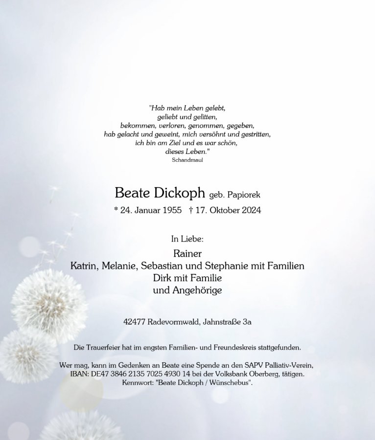 Es tut mir unendlich leid, dass Beate so früh von dieser Welt gehen musste. Ich wünsche euch Kraft und Zuversicht und nur die schönen Erinnerungen, die ihr mit Beate erleben durftet. Mein Mitgefühl ist bei euch allen. Ein lieber Gruß zum Abschied. Anja
