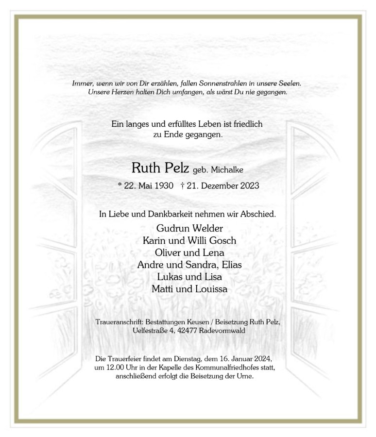 Liebe Omi, In unserem Herzen wirst Du ewig weiterleben. Auch wenn du nicht mehr bei uns bist, fühlen wir deine Wärme und Liebe. Wir vermissen Dich sehr.