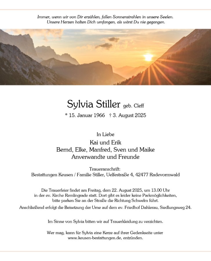 mit tiefer Trauer haben wir die Nachricht erhalten, dass Sylvia ihren tapferen Kampf verloren hat. Sie war ein wunderbarer Mensch und wird in unseren Herzen immer einen Platz haben. Wir wünschen euch in dieser schweren Zeit viel Kraft.